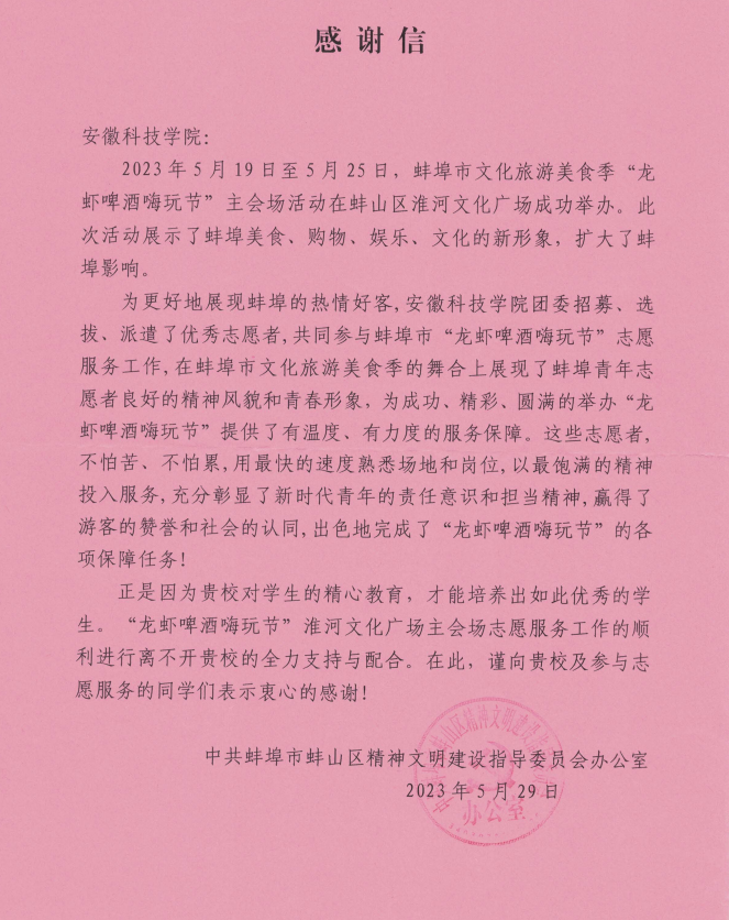 感谢信提到,九州平台团委招募、选拔、派遣了优秀志愿者,共同参与蚌埠市“龙虾啤酒嗨玩节”志愿服务工作,在蚌埠市文化旅游美食季的舞合上展现了蚌埠青年志愿者良好的精神风貌和青春形象,为成功、精彩、圆满的举办“龙虾啤酒嗨玩节”提供了有温度、有力度的服务保障。志愿者们不怕苦、不怕累,用最快的速度熟悉场地和岗位,以最饱满的精神投入服务,充分彰显了新时代青年的责任意识和担当精神,赢得了游客的赞誉和社会的认同,出色地完成了“龙虾啤酒嗨玩节”的各项保障任务!正是因为贵校对学生的精心教育,才能培养出如此优秀的学生。“龙虾啤酒嗨玩节”淮河文化广场主会场志愿服务工作的顺利进行离不开贵校的全力支持与配合。在此,谨向贵校及参与志愿服务的同学们表示衷心的感谢。