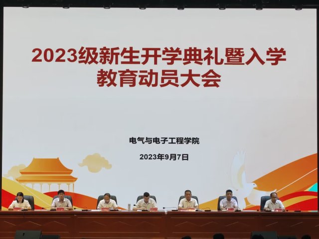 9月7日下午,电气与电子工程学院于东辅楼二楼报告厅隆重举行2023级新生开学典礼暨新生入学教育动员大会。学院党委书记骆海邦,党委副书记、院长夏显明,党委副书记、纪委书记尚磊,党委委员、副院长国海、樊晓宇,党委委员李双喜出席本次会议,各系主要负责人、教学秘书、全体辅导员及2023级新生参加此次会议。会议由骆海邦主持。