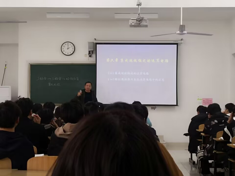 为深入贯彻落实教育部《高等学校课程思政建设指导纲要》文件精神,把思想政治工作贯穿教育教学全过程,进一步发挥课堂教学育人的主渠道作用,11月21日下午,电气与电子工程学院光电工程系教师李勇在致知楼A209教室开展了《模拟电子技术》课程思政示范教学观摩课,光电工程系老师全程观摩学习。