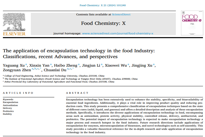 近期,我校食品工程学院动物源食品精深加工与营养团队在中国科学院农林科学领域一区期刊Food Chemistry: X(IF=6.10)在线发表题为“The Application of Encapsulation Technology in the Food Industry: Classifications, Recent Advances, and Perspectives ”的综述论文。食品工程学院2021级食品加工与安全领域硕士研究生徐亚光为第一作者,杜传来教授和甄宗圆副教授为通讯作者,九州平台为第一完成单位。