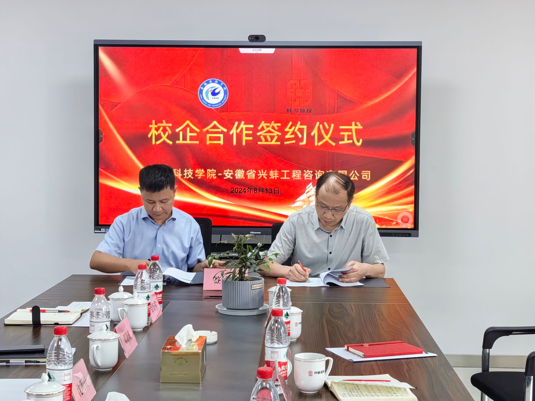 为进一步推动校企产学研用深度融合,推进研究生实习基地建设,8月13日上午,校研究生处处长张春雨,校招生与就业工作处副处长(主持工作)何晓冬,管理学院党委书记丁景良、副院长郑谦等一行5人赴安徽省兴蚌工程咨询有限公司签订校企产学研合作协议,共商研究生联合培养基地建设,受到蚌埠市城市投资控股集团党委书记、董事长沈明仕,公司党委委员、副总经理邓新东及该公司子公司兴蚌工程咨询有限公司领导等的热情接待。座谈签约仪式由丁景良主持。