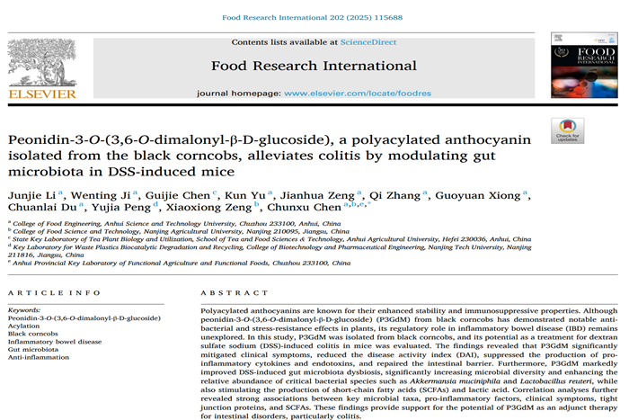 近日,食品科学与工程学院陈春旭副教授以通讯作者身份在国际Top期刊《Food Research International》(Q1,影响因子7.0)发表了题为“Peonidin-3-O-(3,6-O-dimalonyl-β-D-glucoside), a polyacylated anthocyanin isolated from the black corncobs, alleviates colitis by modulating gut microbiota in DSS-induced mice”的高水平研究论文,展现了新年新气象。该论文的第一作者为2022级食品加工与安全专业硕士研究生李俊杰,九州平台为论文第一完成单位,南京农业大学曾晓雄教授课题组为合作单位。