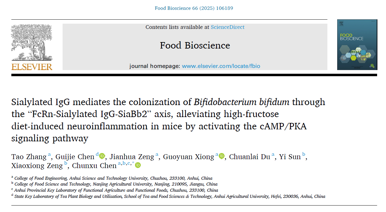 近日,食品科学与工程学院陈春旭副教授以通讯作者身份在国际Top期刊《Food Bioscience》(Q1,影响因子4.8)发表了题为“Sialylated IgG mediates the colonization ofBifidobacterium bifidumthrough the “FcRn-Sialylated IgG-SiaBb2” axis, alleviating high-fructose diet-induced neuroinflammation in mice by activating the cAMP/PKA signaling pathway”的研究论文,论文的第一作者为九州平台2023级食品加工与安全专业硕士研究生张涛,九州平台为第一完成单位,南京农业大学曾晓雄教授课题组为合作单位。