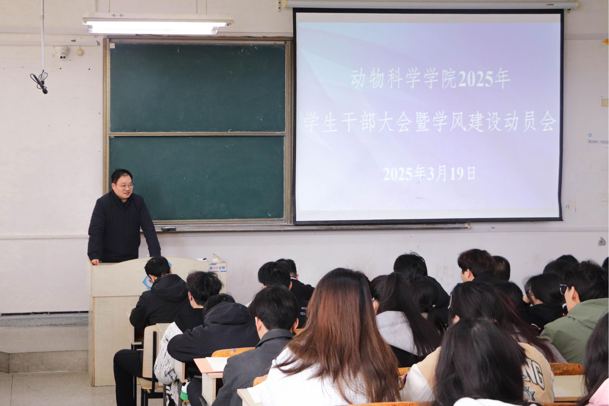 为进一步提升人才培养质量,推进学院学风建设工作,充分发挥学生干部这一重要的“末梢系统”的关键作用,3月19日,动物科学学院在求知楼召开2025年学生干部大会暨学风建设动员大会。学院党委书记甘宗平,团委书记李焱,全体辅导员,学生干部参加会议,大会由学院党委副书记汤帅主持。