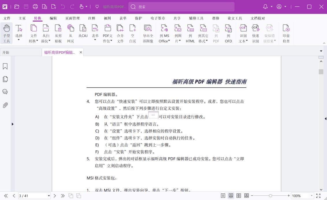 们利用福昕高级PDF编辑器打开一份文档,菜单栏包含“转换”“编辑”“页面管理”“注释”等,点击会出现相应的小功能。