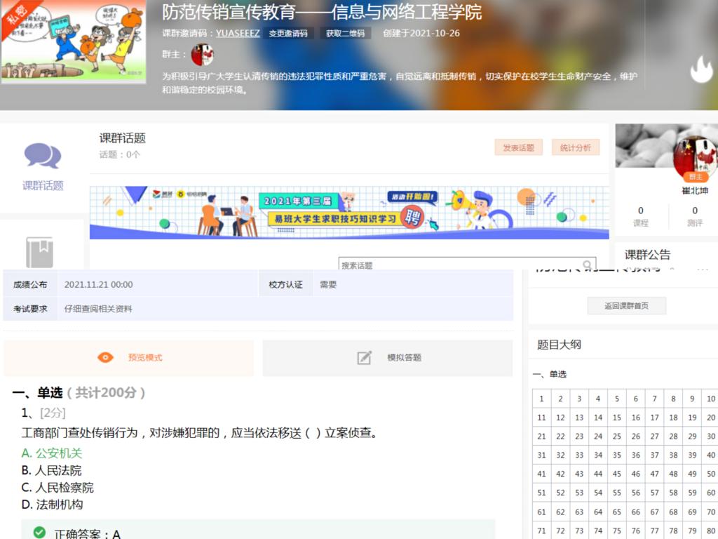 为引导广大学生认清传销的违法犯罪性质、欺诈本质和严重危害,增强学生安全防范意识。10月23至今,信息与网络工程学院通过搭建(易班)轻应用倡议书、普法视频以及优课知识竞赛等多种形式,向全院1500多名学生开展了一系列防范传销宣传教育主题活动,深入普及防范传销知识。