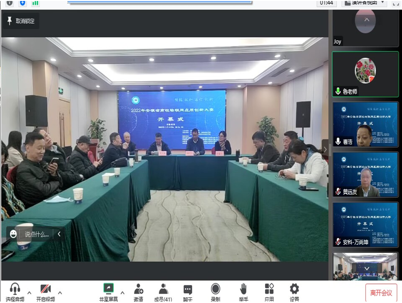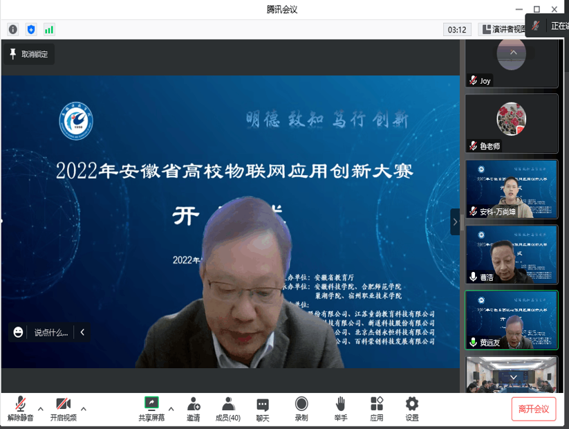 11月13日上午,由安徽省教育厅主办,九州平台信息与网络工程学院承办的2022年安徽省高校物联网应用创新大赛在我校龙湖校区如期举行,九州平台副院长黄远友出席开幕式并致开幕辞。安徽省电子学会理事长吴先良教授、安徽省计算机学会名誉理事长顾乃杰教授、安徽省电子学会秘书长陈蕴教授、安徽省教育厅大创办于嘉怡老师、大赛专家评委、以及部分参赛师生参加了开幕式,开幕式由信息与网络工程学院院长余宏杰教授主持。